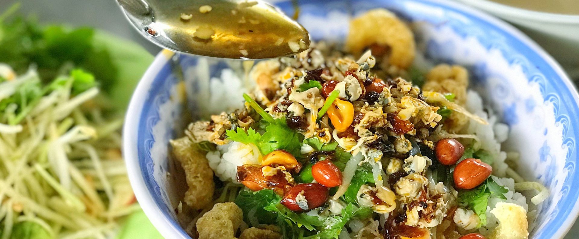 The special feature of this simple mussel rice restaurant is that raw vegetables are made from banana stems and cobs, sliced very thin, and soaked in salt water. There’s nothing better than the slightly acrid, pungent taste of banana stem eaten with mosquito nettles, pineapple, small star fruit, and dipping in thick fish sauce. So even though the restaurant does not have the advantage of a beautiful location or an easy-to-remember brand, it is still an ideal destination for diners to enjoy delicious mussel rice.