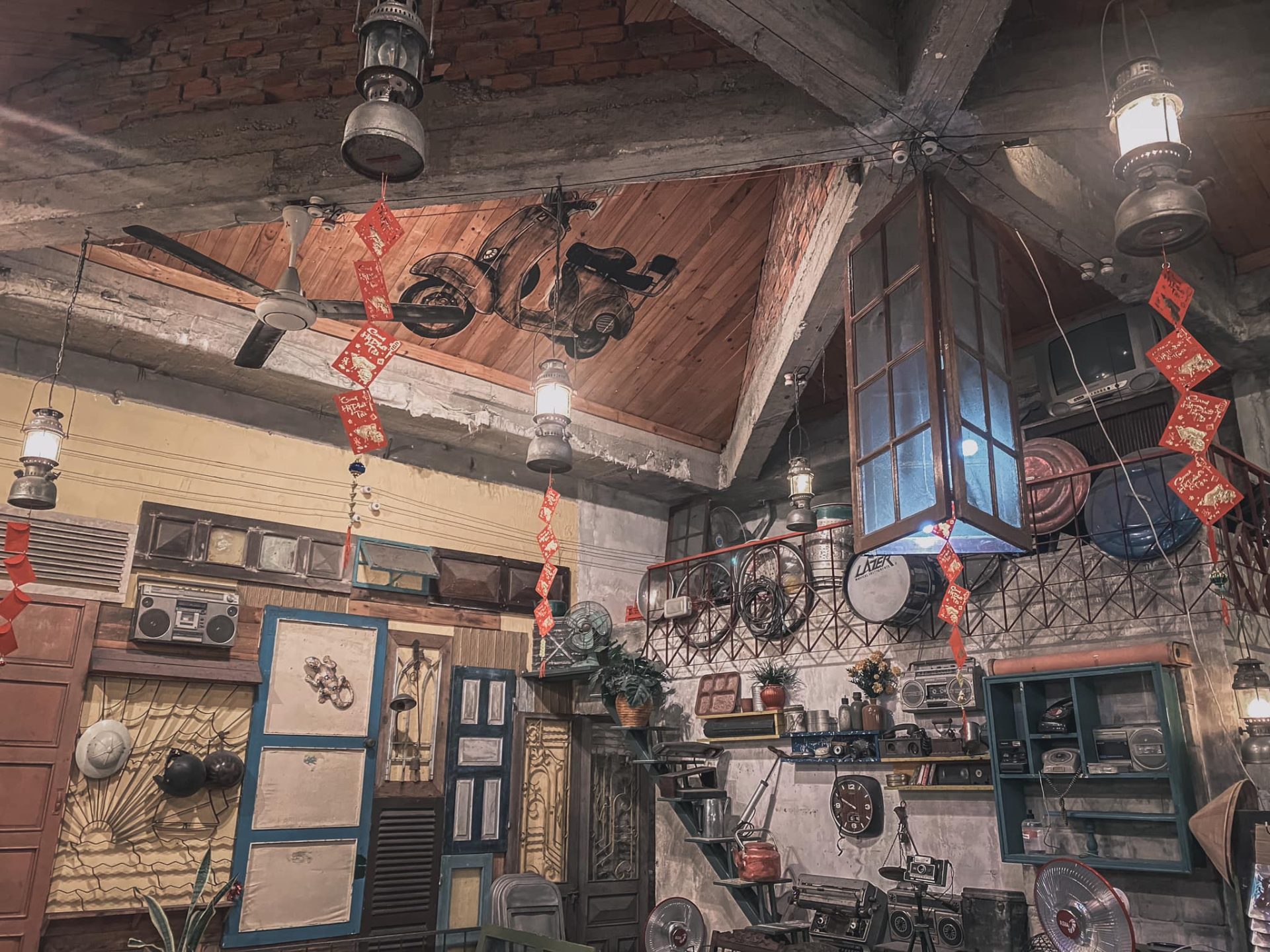 However, just because you see different tables and chairs, don’t think that the interior at Danang 1975 Café is all patchwork! Each table and chair is carefully collected and selected by the shop owner in the style of ancient subsidies. In addition, you will still see glimpses of normal, modern wooden chairs. It all fits together strangely. From the table recycled from a sewing machine table, or the H-shaped tea table of our grandparents in the past, to the ceiling lamps are also extremely “1975” because they are old-fashioned oil lamps. All decorative interior details are familiar items of our grandparents in the past, so it will give you nostalgia for your grandparents’ home. From a very precious old Saigon fan, a landline telephone, a cassette, a radio to a beautiful antique charcoal iron. If you were born in the 8x or 9x period, this place will definitely evoke a lot of childhood memories for you.