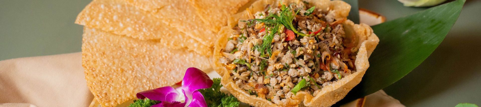 Rice rice paper is a rustic but “memory” snack of Hue people. Fresh mussels are fried with lemongrass, chili, onions, laksa leaves and spices, creating a charming aroma and an irresistible taste. When eating, the mussel is displayed on a plate, served with crispy baked cakes. Break the hot piece, hot mussels and enjoy you will feel the natural sweetness of mussels, a little spicy of lemongrass, blending and the typical aroma of laksa leaves.