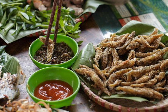 Due to the characteristics of stream fish, it cannot be braised or steamed, but can only be grilled to fully enjoy its flavor. Besides the famous grilled stream fish, crispy fried stream fish is also very special. The fish fried in a pan of fat turns golden yellow and gives off a rich aroma. Not only can you eat the sweet, crispy fish meat, but you can also eat the fatty, crispy fish head, and you can chew the crispy fish bones too. Add a cup of sweet and sour fish sauce mixed with lemon and chili to eat as much rice as you need.