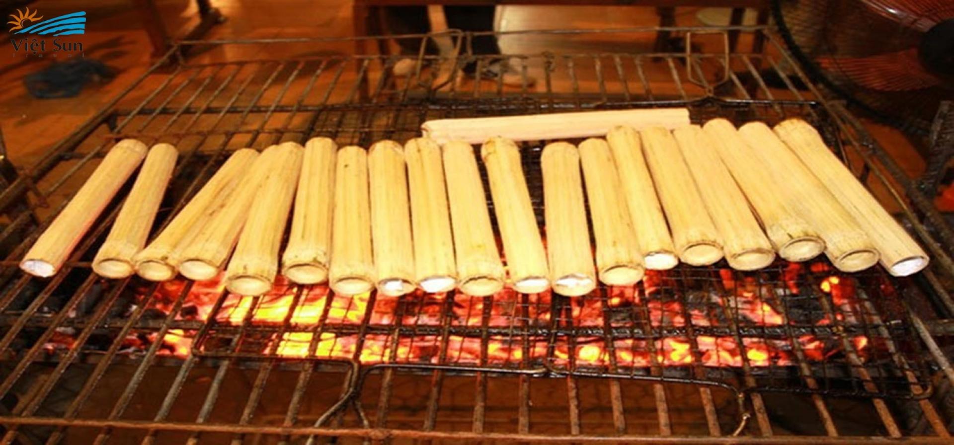 Lam rice is cooked from bamboo tubes, extremely fragrant, crispy on the outside, soft and flexible on the inside, combined with delicious sesame salt, extremely attractive. The dish is simple but provides you with a nutritious, energetic and extremely delicious meal. This is an extremely suitable dish for long trips, camping in the forest or hunting. Just bring a bamboo tube containing rice, when going into the forest, use spring water to cook and you will have a complete meal. perfect.