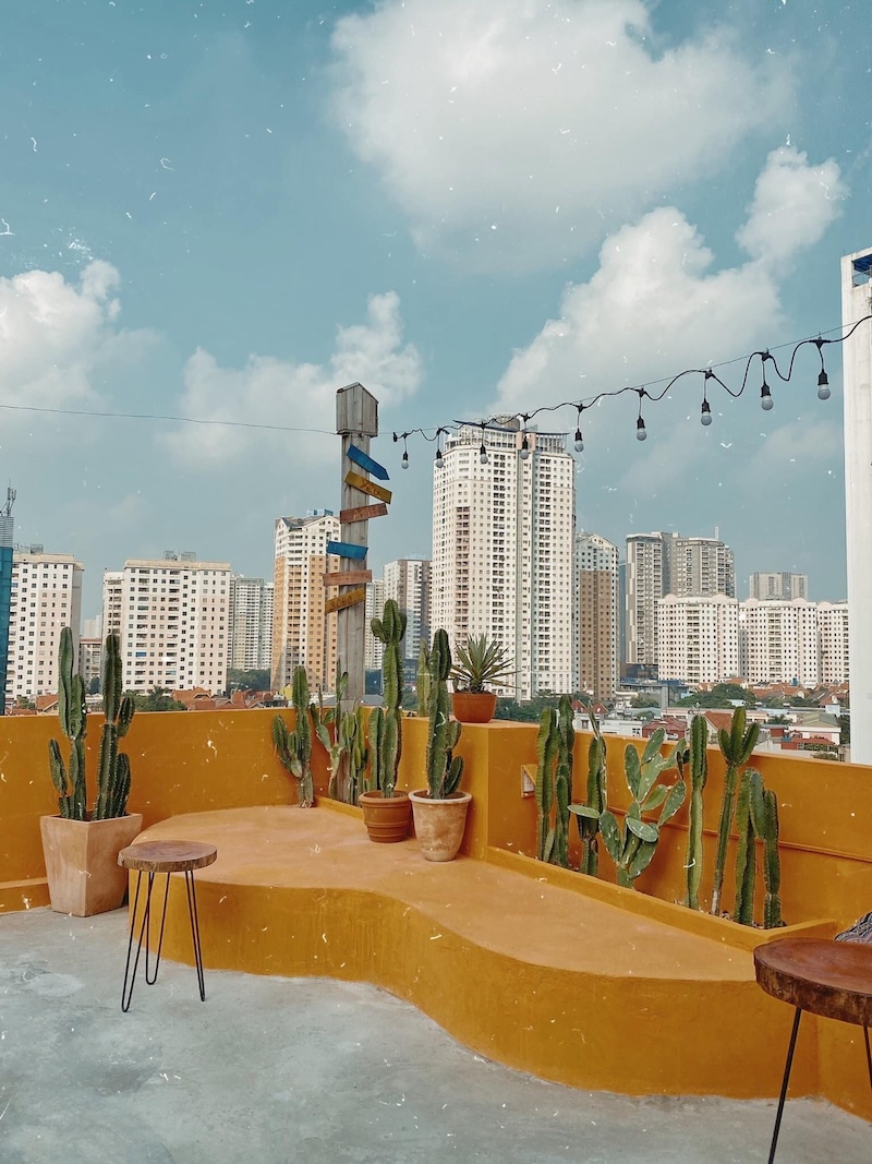 EM Rooftop is a cafe that always knows how to conquer everyone with its diverse decor styles, always innovating according to each festival. This Tet, the restaurant brings bright spring colors with fresh peach branches, red couplets, and green banh chung. The shop has three floors, including an airy outdoor space, very suitable for taking photos.