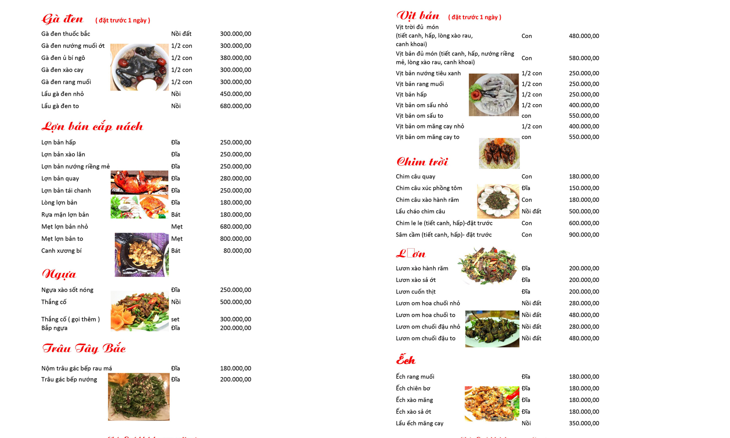 The main dish menu of Viet Deli establishment 1 is divided into categories: vegetables, salmon, sturgeon, ban chicken, black chicken, armpit ban pig, horse, northwest buffalo, ban duck, wild bird, eel, frog, shrimp, squid, hot pot, soup dishes. Hundreds of dishes are always ready to serve diners.
